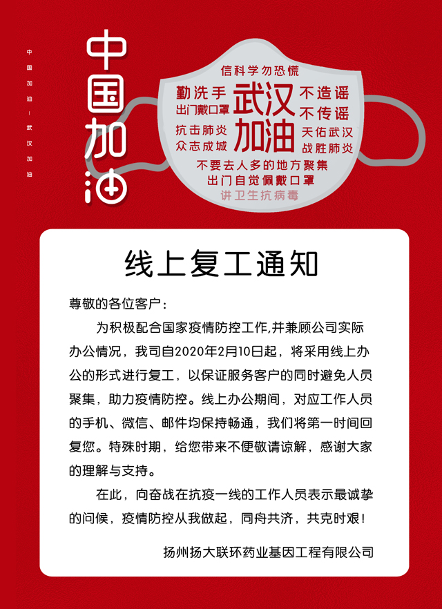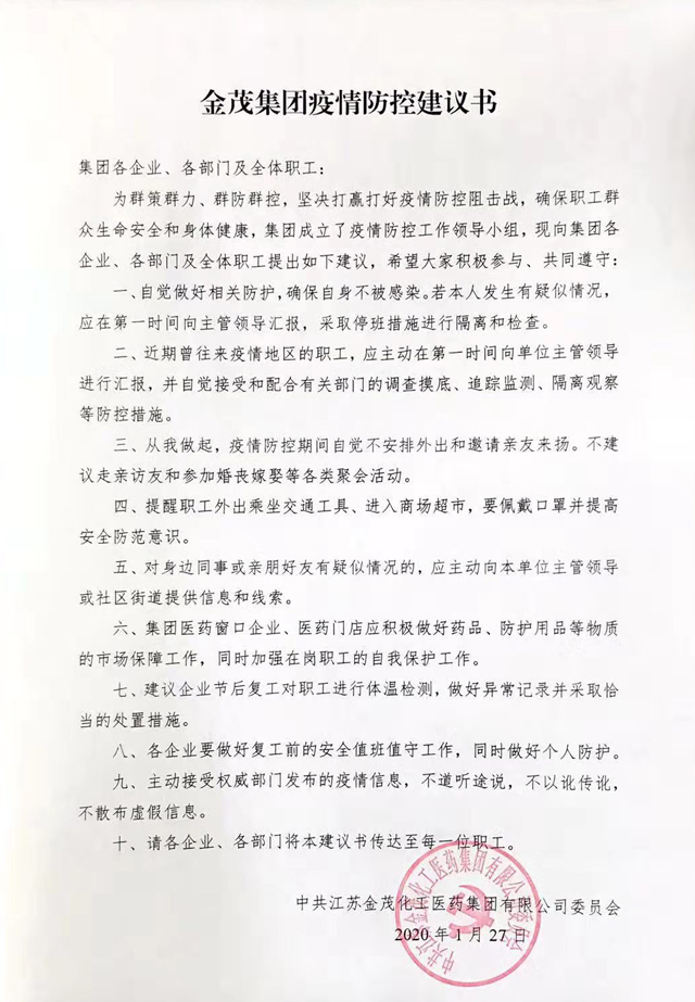 目前新型冠狀病毒肆虐,疫情防控工作形勢十分嚴峻,全省已啟動突發公共衛生事件一級響應。根據揚州市委、市政府工作要求,貫徹落實金茂集團關于疫情防控文件精神,堅決打贏打好疫情防控阻擊戰。基因公司第一時......