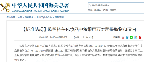 7月16日,海關總署官網消息稱,歐盟將在化妝品中禁限用萬壽菊提取物和精油。 歐盟官方公報7月12日消息,歐盟委員會7月9日發布法規(EU)2018/978,修訂歐......