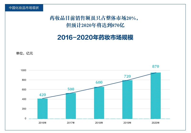 作為市場后起之秀,中國的藥妝品目前銷售額僅占整體市場的20%,但以其快速增長的態(tài)勢,預(yù)計(jì)市場規(guī)模在2020年將達(dá)到870億元。
