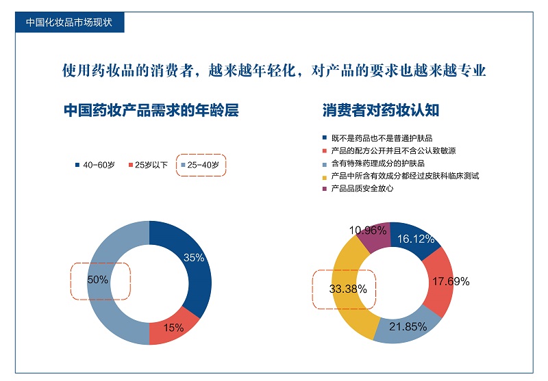 當(dāng)前國內(nèi)藥妝市場呈現(xiàn)出兩大特點(diǎn),一是藥妝消費(fèi)者逐漸呈年輕化趨勢,在國內(nèi)藥妝產(chǎn)品需求的年齡層中,25-40歲年齡層的消費(fèi)者占比50%,25歲以下消費(fèi)者亦有15%的占比。二是消費(fèi)者對(duì)藥妝產(chǎn)品的要求也越來越專業(yè),在對(duì)藥妝產(chǎn)品的認(rèn)知中,33.38%的消費(fèi)者已經(jīng)形成了“藥妝產(chǎn)品中所含有效成分都經(jīng)過皮膚科臨床測試”這一清晰準(zhǔn)確的認(rèn)知。