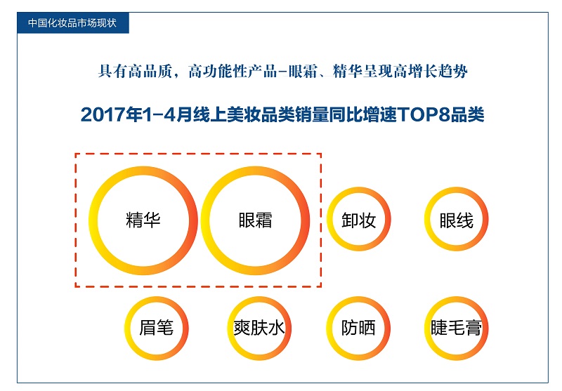 3.隨著消費(fèi)者美妝意識(shí)不斷成熟,高品質(zhì)、高功能性的產(chǎn)品在市場上呈現(xiàn)出高增長趨勢,在2017年1-4月線上美妝品類銷量同比增速TOP8品類中,精華和眼霜遙遙領(lǐng)先。