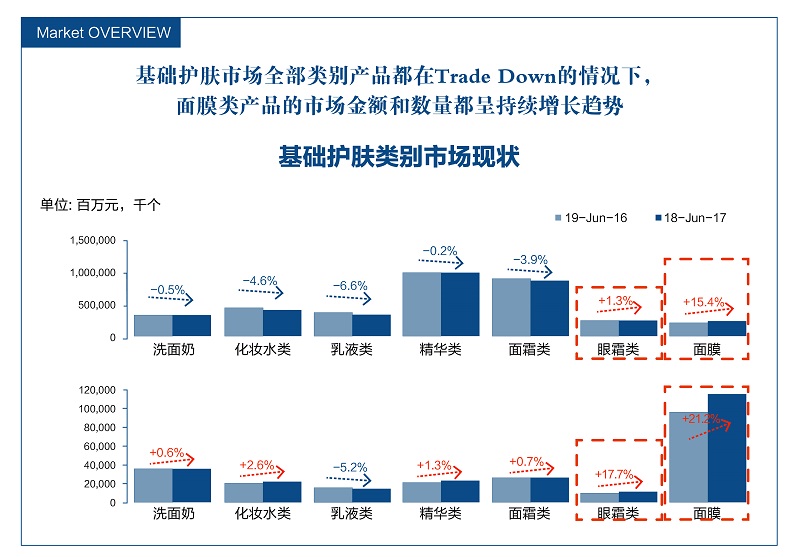 在基礎(chǔ)護(hù)膚市場全部類別產(chǎn)品都處于Trade down的情況下,面膜類產(chǎn)品的市場金額和數(shù)量都保持著持續(xù)增長趨勢,以今年六月為期,面膜銷售額與去年同比增長21.2%。